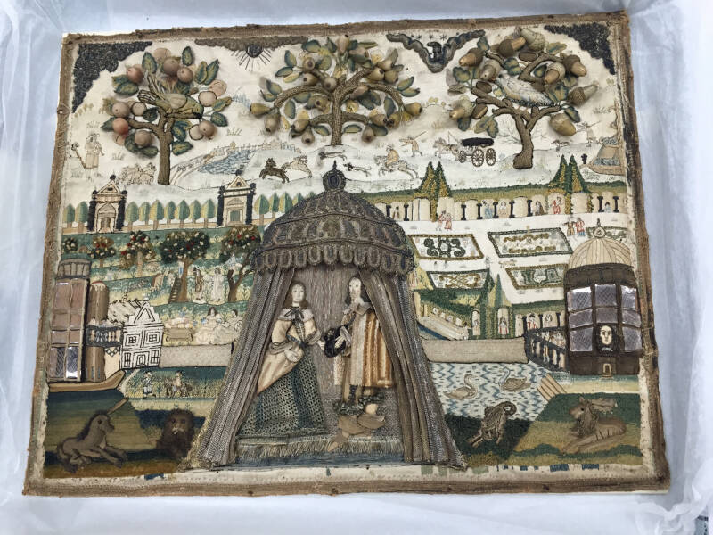The simple answer is that embroidered items are dimensional. We see so many things in person that just aren’t apparent in a photograph. This pictorial piece in the Colonial Williamsburg Foundation is a gorgeous example. It is highly dimensional with padded, raised, and appliqued work featured in many areas to create a visually rich story. A high-res image would be taken from the top, looking straight down. But the true details of the dimensionality don’t show up until we take a picture from the side: see the acorns or the tiny picots on the cuff of the gentleman in the pavilion.